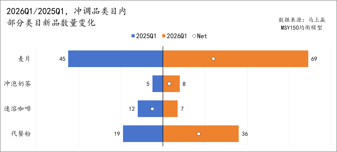 2026Q1,冲调品下各类目的新品数量变化上,同样与健康推动有着一定关系。其中麦片、代餐粉的新品数量多,且2026Q1同比2025Q1新品数量均有显著提升;冲泡奶茶、速溶咖啡的新品数量较少,其中冲泡奶茶新品数量同比微增,速溶咖啡新品数量则是同比微减。