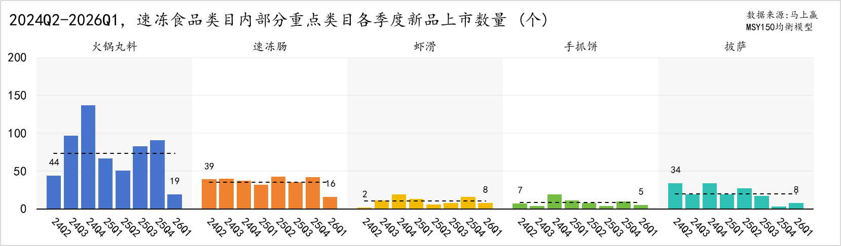 速冻肠2024Q2-2025Q4的上新数量保持在30以上,2026Q1则出现下降;披萨在2024Q2-2025Q3上新数量较多,但从2025Q4开始锐减;虾滑、手抓饼的季度上新数量基本在个位数浮动,数量少变化也不大。