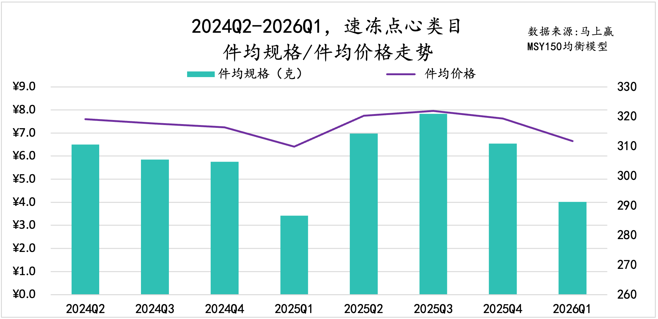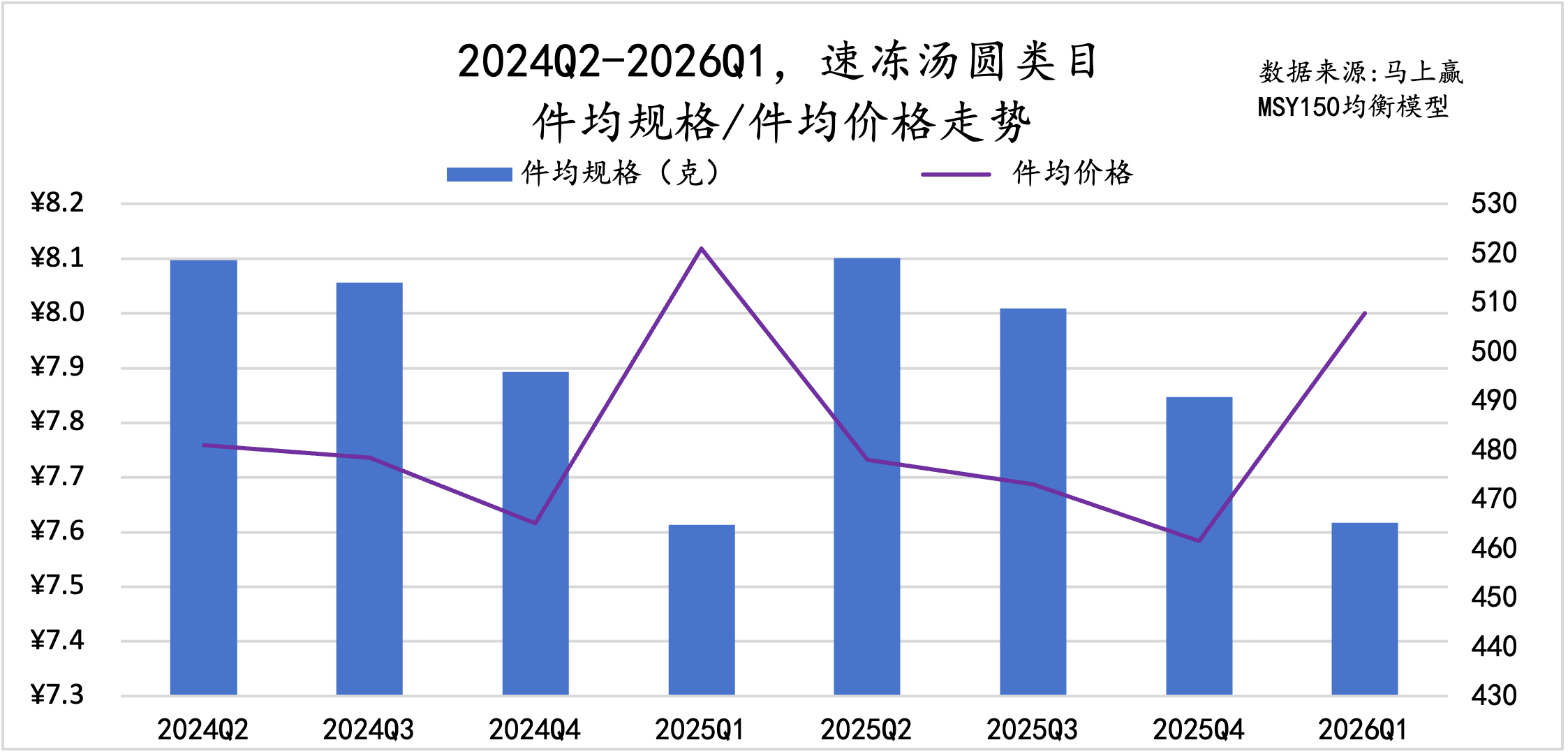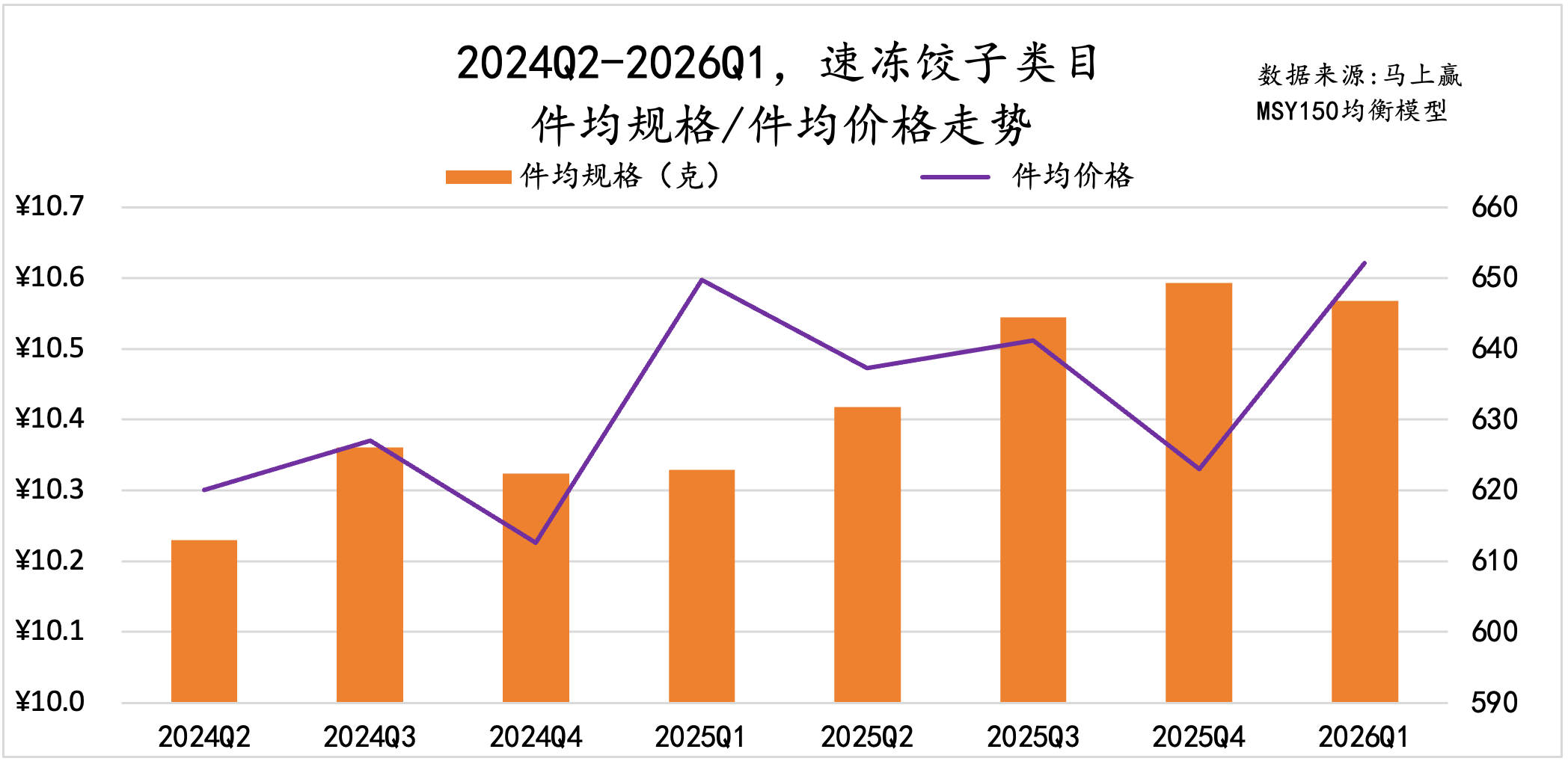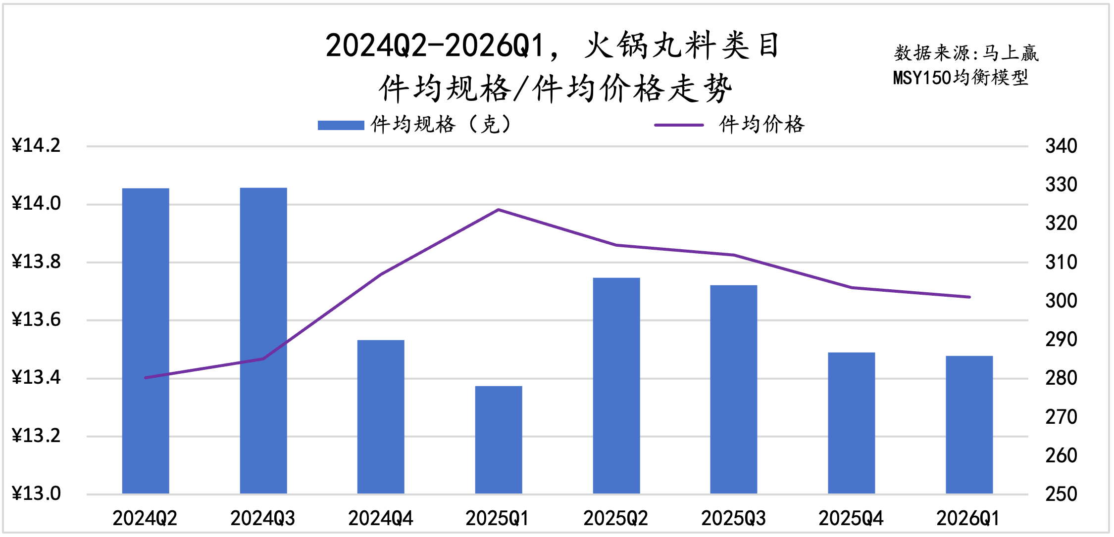 从件均规格、价格变化来看,速冻汤圆的件均规格呈现明显的季节性变化,从Q2到次年Q1逐渐减小,但过去一年同比再上一年件均规格有小幅度下滑;件均价格上,2026Q1的件均价低于去年同期。