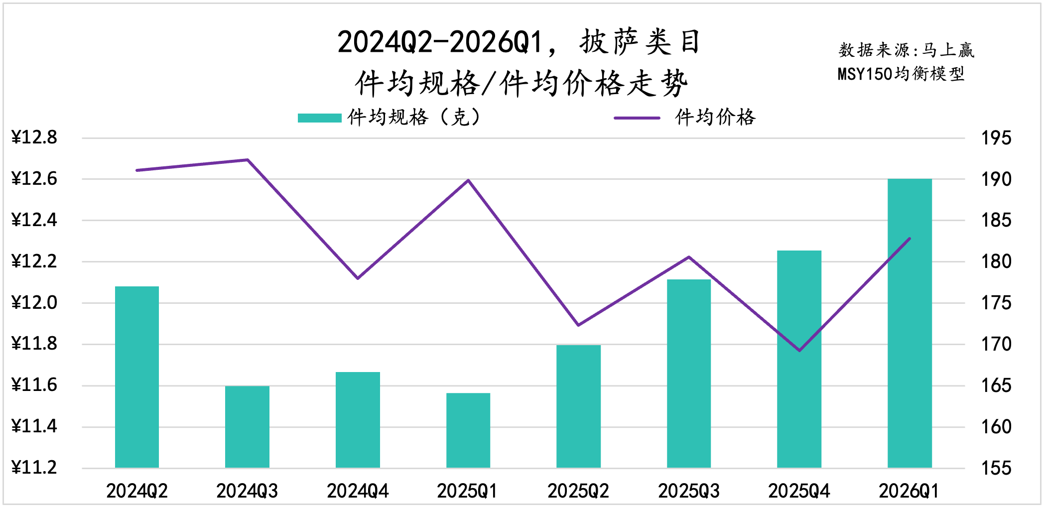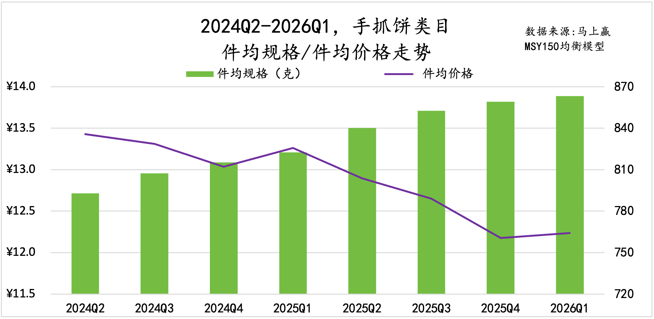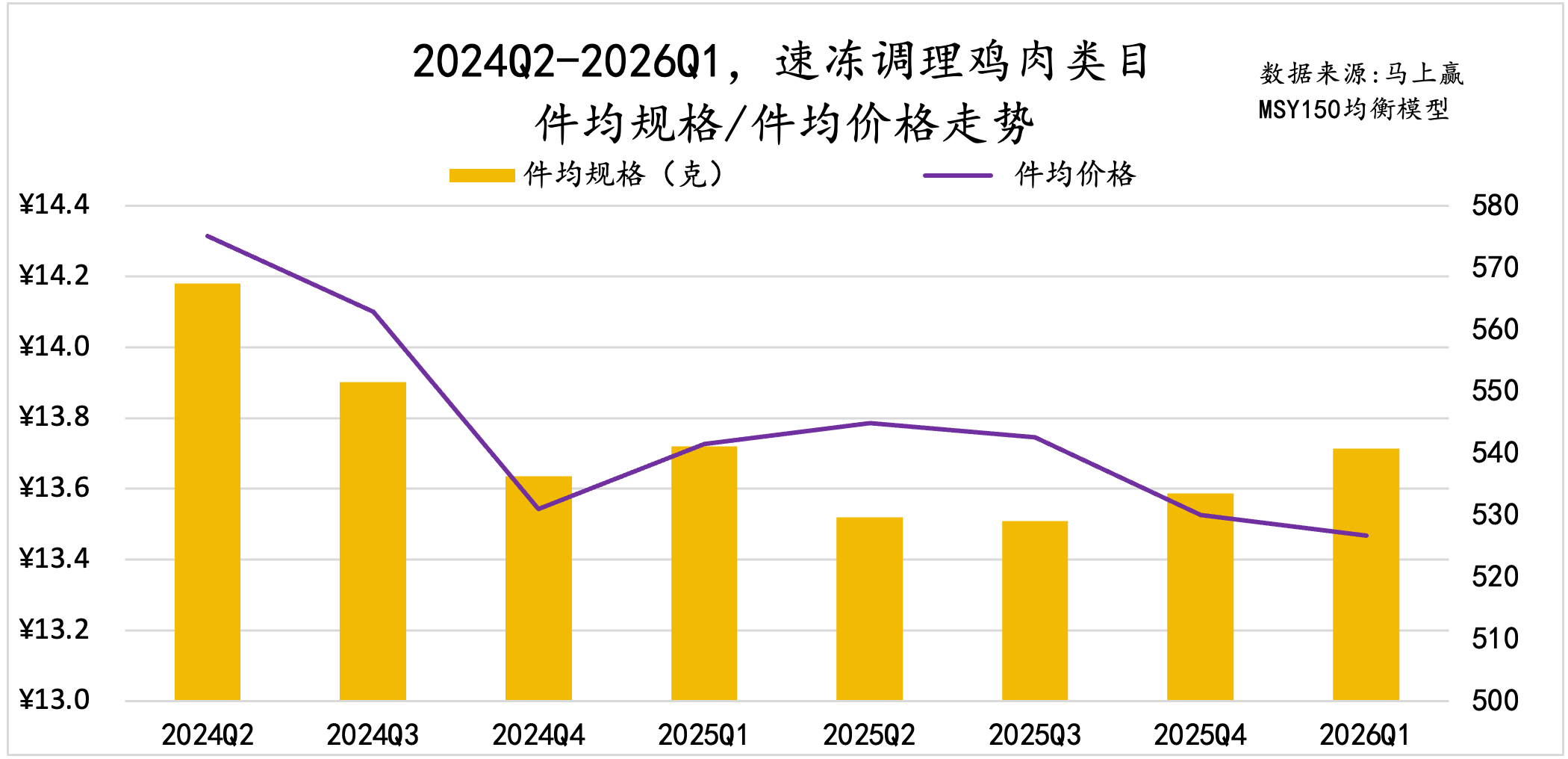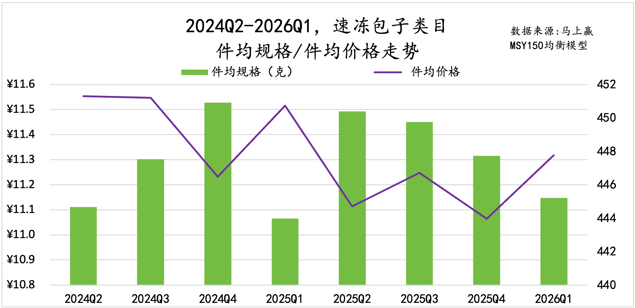 从件均规格、价格变化来看,速冻汤圆的件均规格呈现明显的季节性变化,从Q2到次年Q1逐渐减小,但过去一年同比再上一年件均规格有小幅度下滑;件均价格上,2026Q1的件均价低于去年同期。