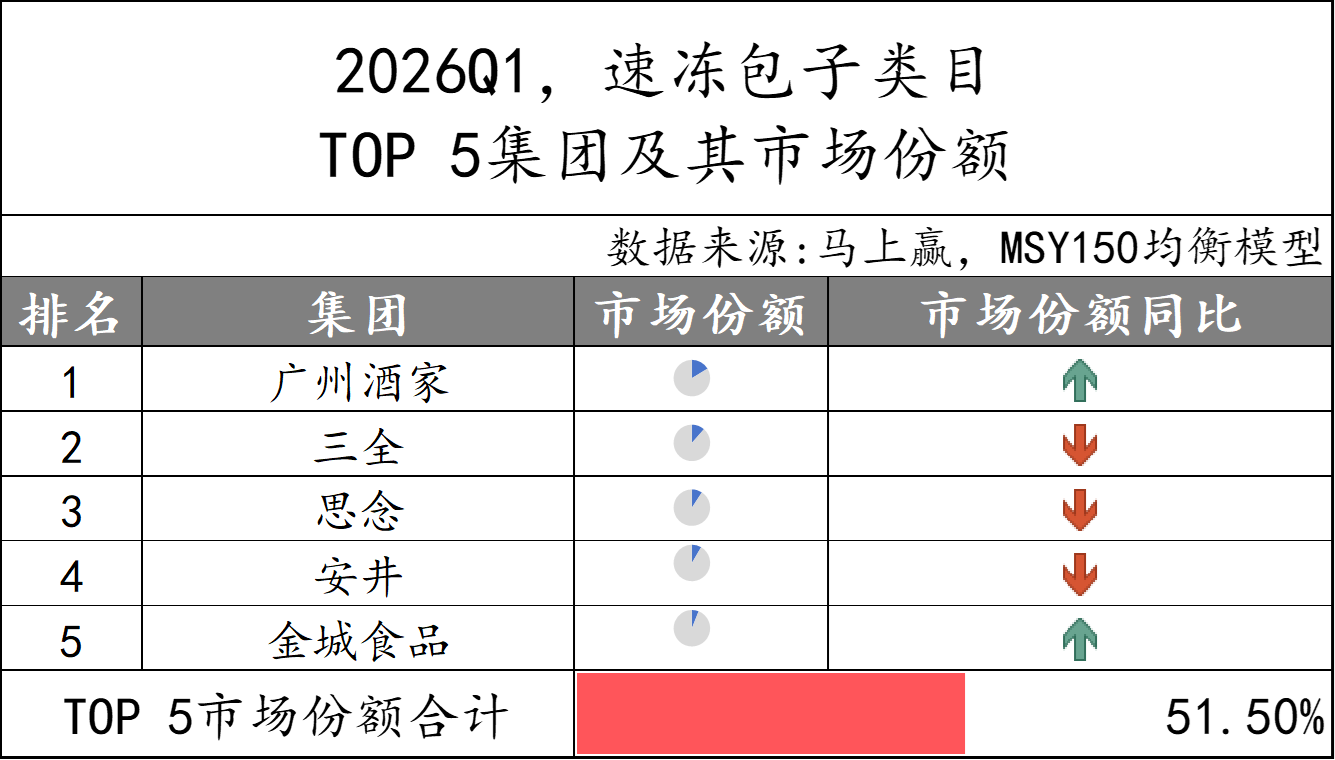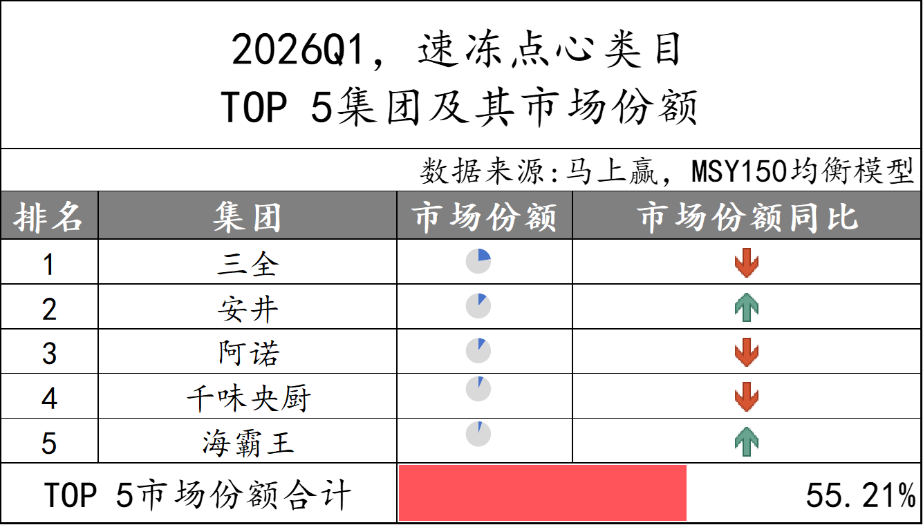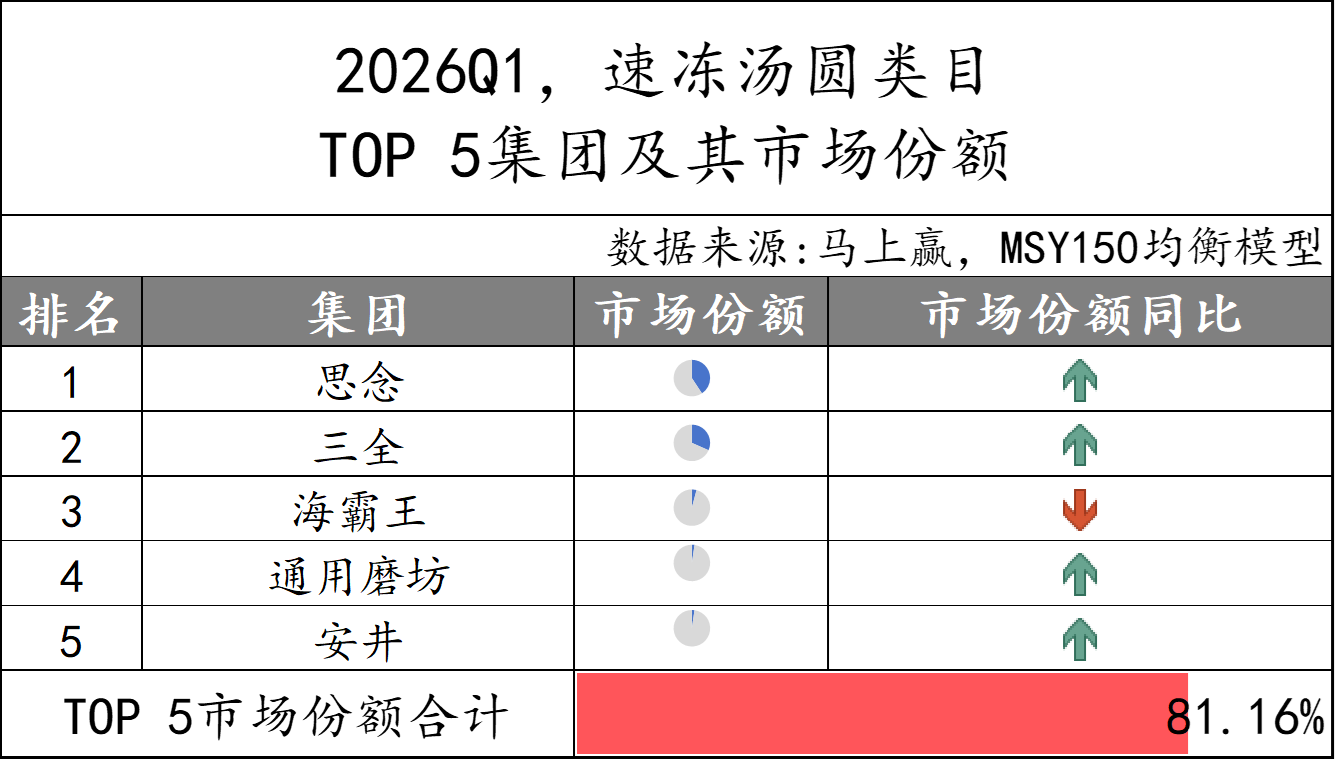 2026Q1速冻汤圆市场份额TOP 5集团分别为思念、三全、海霸王、通用磨坊和安井,市场份额合计超过80%,集中度较高。集团份额变动上,仅海霸王的市场份额同比下降,其余集团市场份额同比均增长。
