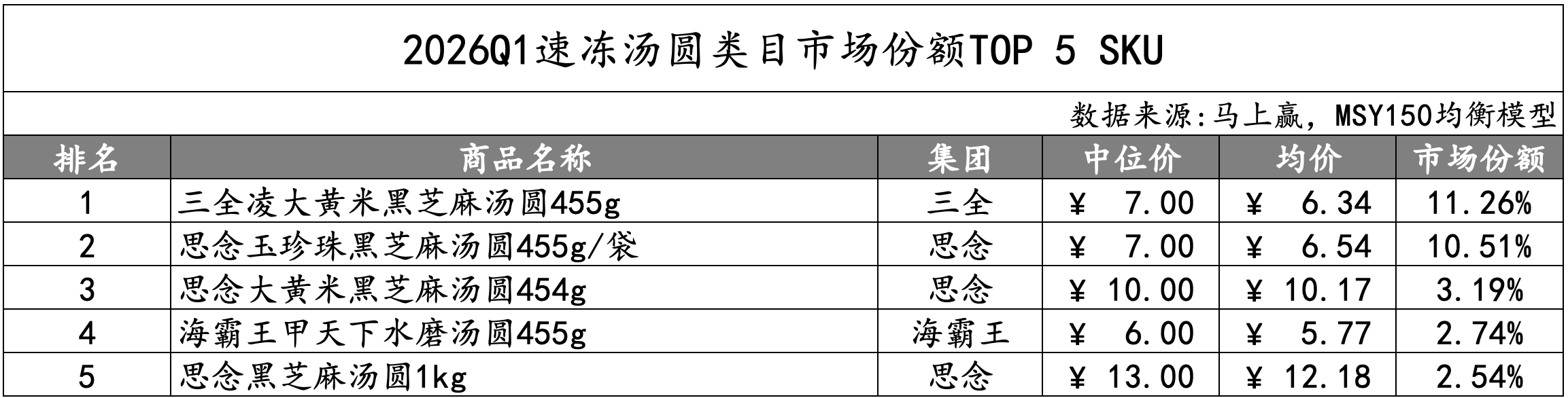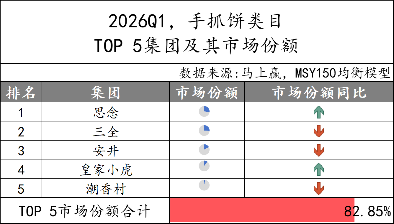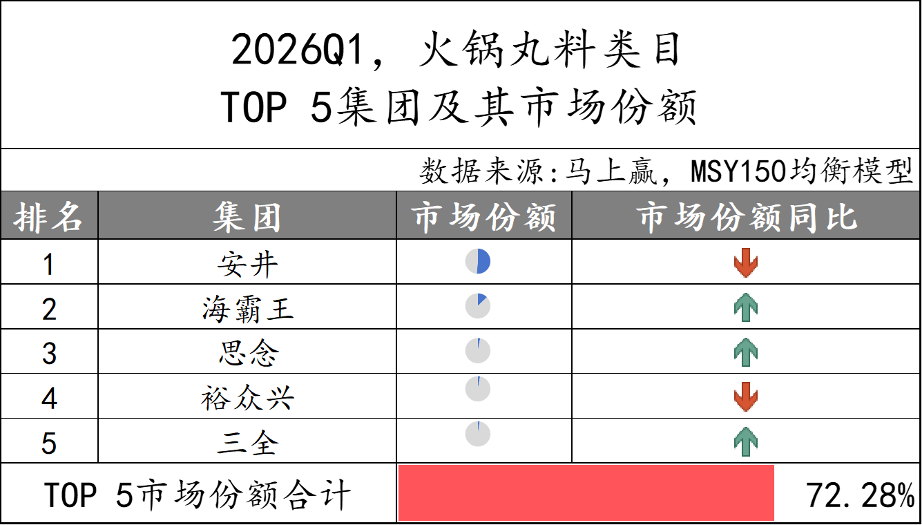 2026Q1速冻汤圆市场份额TOP 5集团分别为思念、三全、海霸王、通用磨坊和安井,市场份额合计超过80%,集中度较高。集团份额变动上,仅海霸王的市场份额同比下降,其余集团市场份额同比均增长。