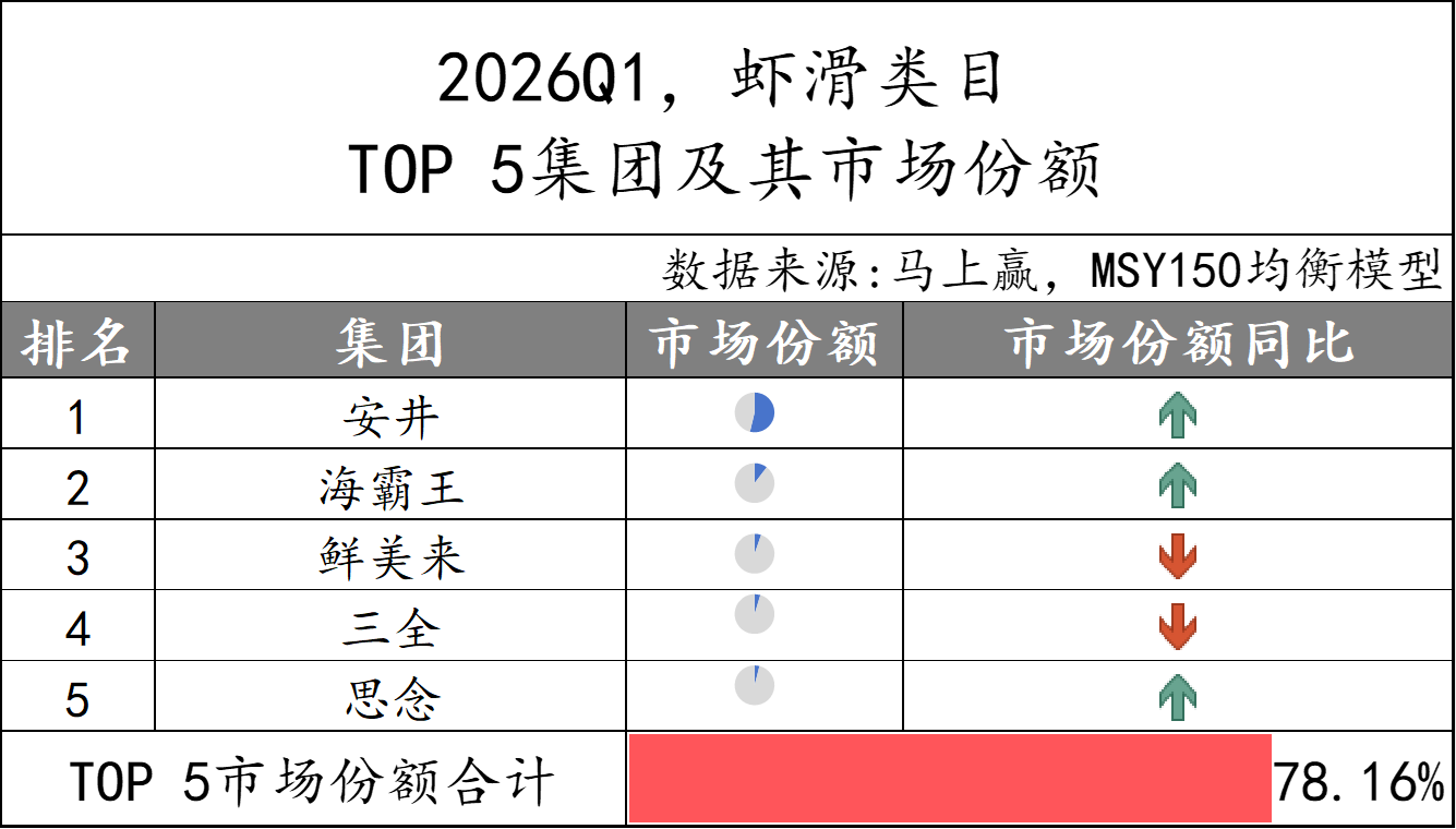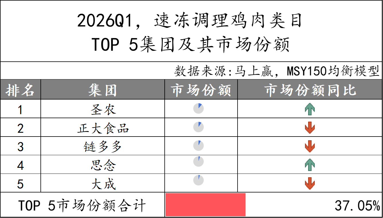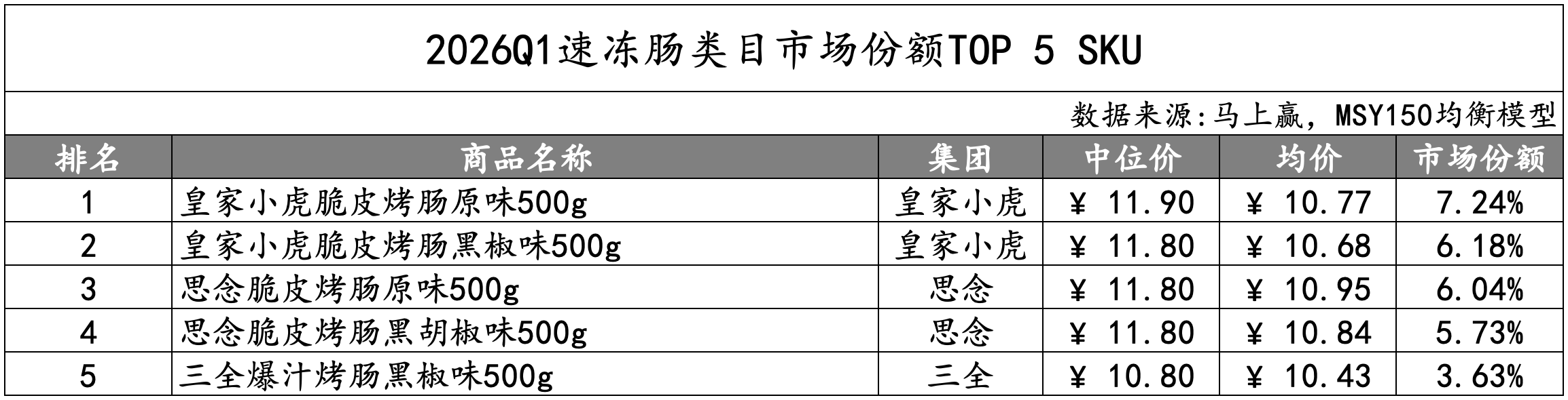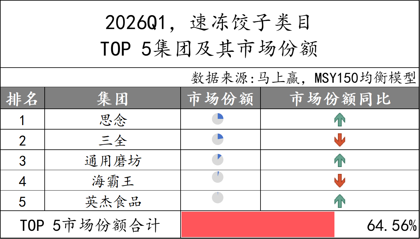 2026Q1,速冻肠类目的TOP 5集团分别为皇家小虎、思念、双汇、安井和三全,市场份额合计56%,类目集中度中等。
