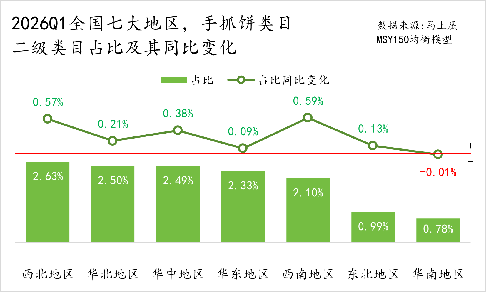 分地区来看,手抓饼在西北、华北、华中地区占比相对较高,东北、华南地区则相对占比较低。从占比同比来看,除华南外各地区占比均同比上涨,其中西北、西南地区占比同比上升超过0.5%,涨势较好。