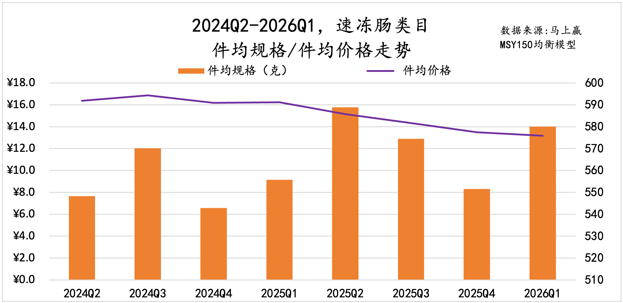 速冻肠类目件均价格从2025Q1开始出现明显的下降趋势,或与类目激烈竞争及价格战相关;件均规格上,速冻肠整体在540g-590g之间波动,有一定的上升趋势。