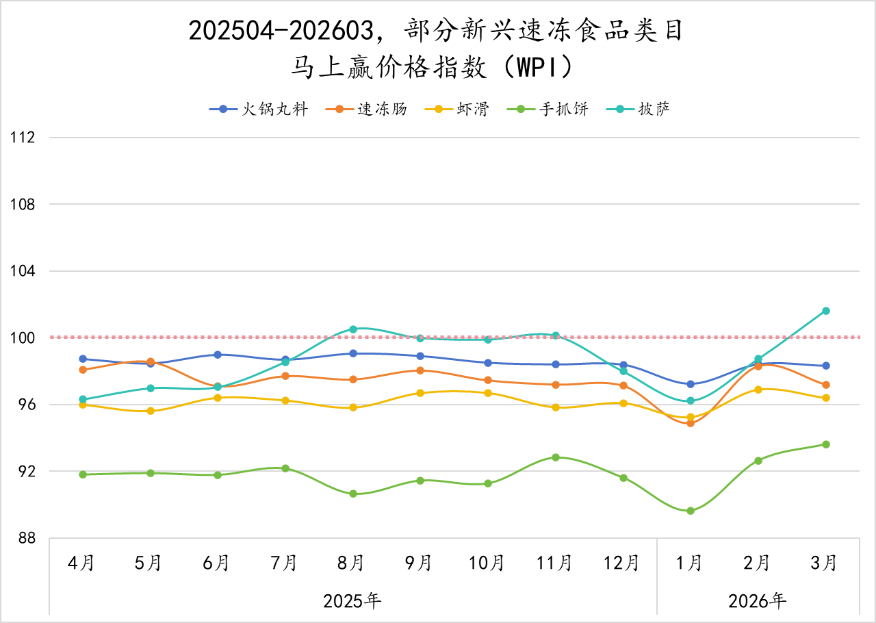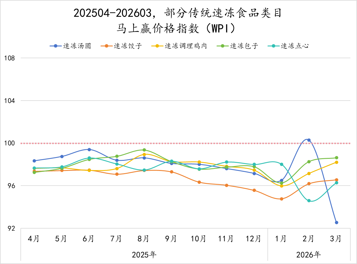 为了更好地分析类目价格的变动与走势,马上赢拉取了2025年4月-2026年3月,速冻食品类目整体及10个重点类目的马上赢价格指数。马上赢价格指数(WPI)以100为基准值,其数值上下波动为类目的价格指数与去年同期价格指数的相对百分比,100表示与去年同月持平,高于100表示同比价格水平上升,低于100则表示同比价格水平下降。