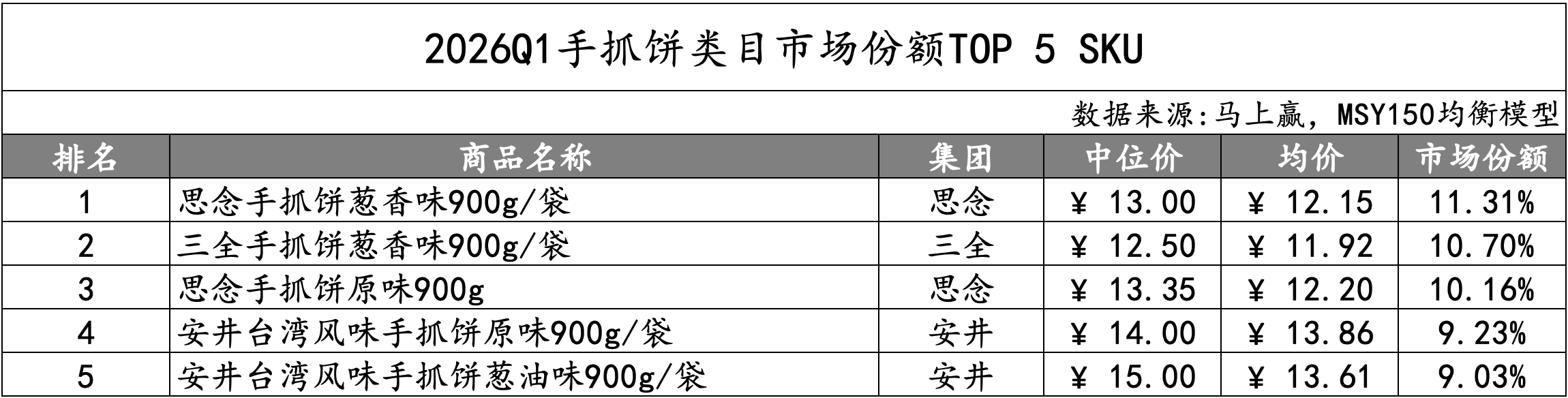 从TOP SKU来看,思念原味、葱香味手抓饼分别位列第一和第三,市场份额超过10%;三全葱香味位列第二,市场份额也超过10%,为TOP 5中价格最低的SKU;安井有两款产品分别位列第四和第五,主打台湾风味价格也相对更高。值得注意的是,2026Q1手抓饼的TOP 5 SKU规格非常统一,均为900g/件。