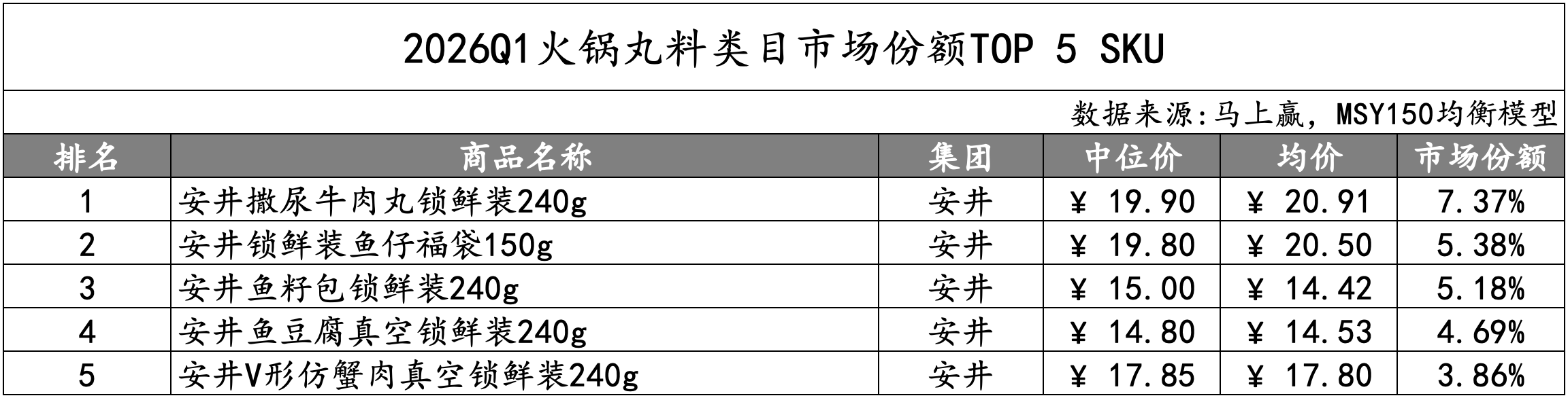 虾滑类目TOP 5 SKU中,安井占据两个名次,分别为相同规格的虾滑和虾滑球,其中大单品虾滑锁鲜装150g单一SKU的市场份额就接近50%,优势相当显著。此外,海霸王、三全和思念分别有一款虾滑产品上榜,其中三全、思念的虾滑都主打了“大颗粒”概念,这也或许将是产品未来发展的概念与方向之一。