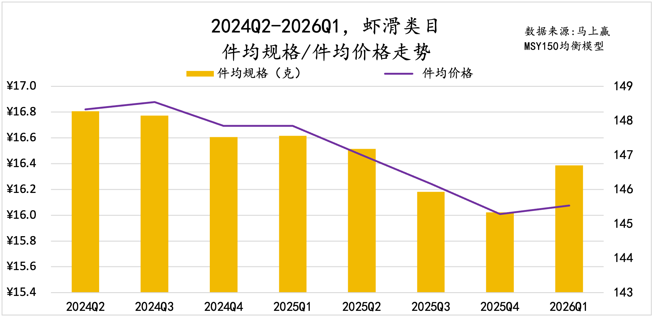 从件均规格和件均价格来看,虾滑类目的“量与价”基本呈同向波动,2024Q3-2025Q4逐步下降,2026Q1略有回升。由于虾滑类目的原料特性——主要原料虾的价格较高且其在产品原料中比例极高,虾滑类目为了保持与其它速冻食品类目相似的件均价格区间,其件均规格明显偏低。