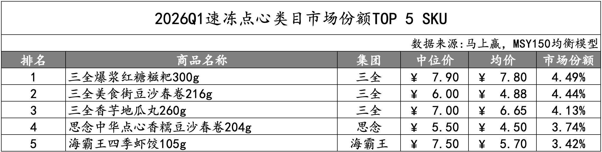 速冻点心的TOP 5 SKU由三全包揽前三,分别为红糖糍粑、豆沙春卷和香芋地瓜丸,价格在7元左右,规格在300g以下,市场份额均超4%。第四名为思念的豆沙春卷,规格、价格都略低于第二名的三全同款商品。第五名则为海霸王的四季虾饺。