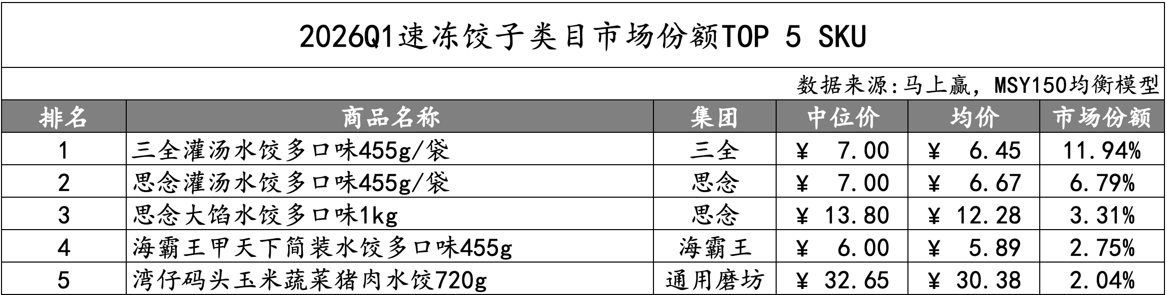 速冻饺子类目的TOP 5 SKU分别为:第一名三全多口味455g产品,是唯一市场份额超10%的SKU。第二名、第三名均为思念,一款产品与三全相似,均价略高于第一名,市场份额超6%;第三名产品主打大馅料、大包装,市场份额超3%。第四名为海霸王的简装水饺,为TOP产品中唯一低于7元的SKU;第五名为通用磨坊集团旗下的湾仔码头,价格带与前四名存在明显差异。