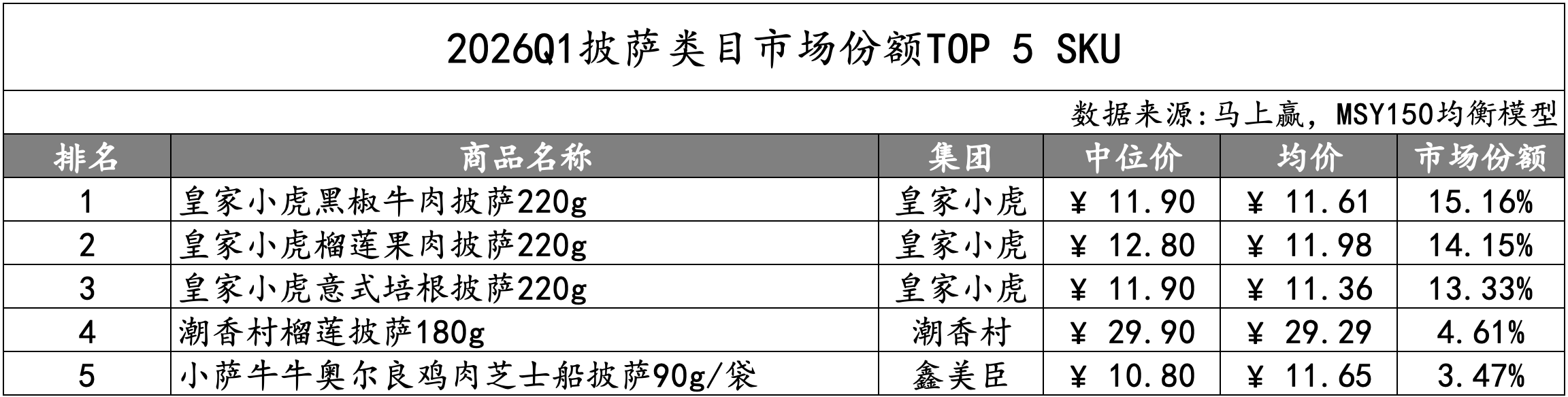 具体到TOP SKU,前三名被皇家小虎220g规格,不同口味的产品占据,三款产品的市场份额均在15%左右,优势较为明显。排在第五名的小萨牛牛芝士船披萨,为一人食的袋装披萨,这一规格比类目主流规格小了将近一半,是否能够成为未来类目流行的产品形态值得进一步关注。
