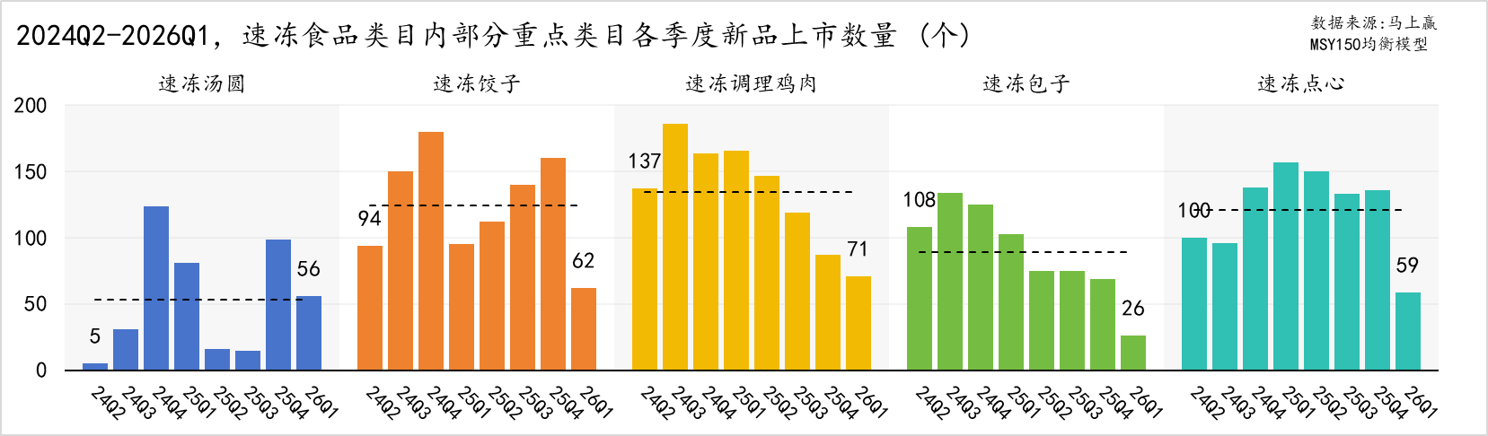 以观察期内季度平均上新数量降序来观察各类目的情况:速冻调理鸡肉2024年各季度上新较多,2025Q1开始上新数量逐季度递减,变化较大;速冻饺子的上新数量则自2025Q1起逐季度上升,但2026Q1新品上市数量不及同比期2025Q1;速冻包子、速冻点心也都在2026Q1创下了新品上市数量新低;火锅丸料的变化趋势与速冻饺子相似——年内逐季上升、同比逐渐走低,2026Q1上新数量已跌至仅19个;速冻汤圆上新数量受季节影响显著,Q4、Q1上新数量较多,Q2、Q3上新较少;