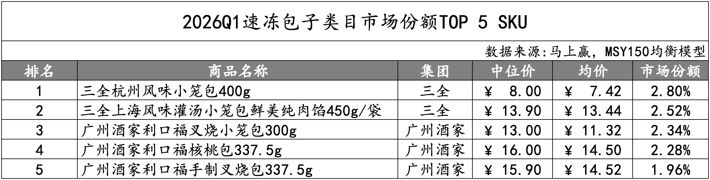 速冻包子的TOP 5 SKU由三全和广州酒家构成。其中,三全占据了前两名,分别为不同价格带的两款地域风味小笼包。广州酒家则包揽了三、四、五名,产品形态分别为叉烧小笼包、核桃包和手制叉烧包。值得注意的是,TOP 5 SKU的市场份额均低于3%。